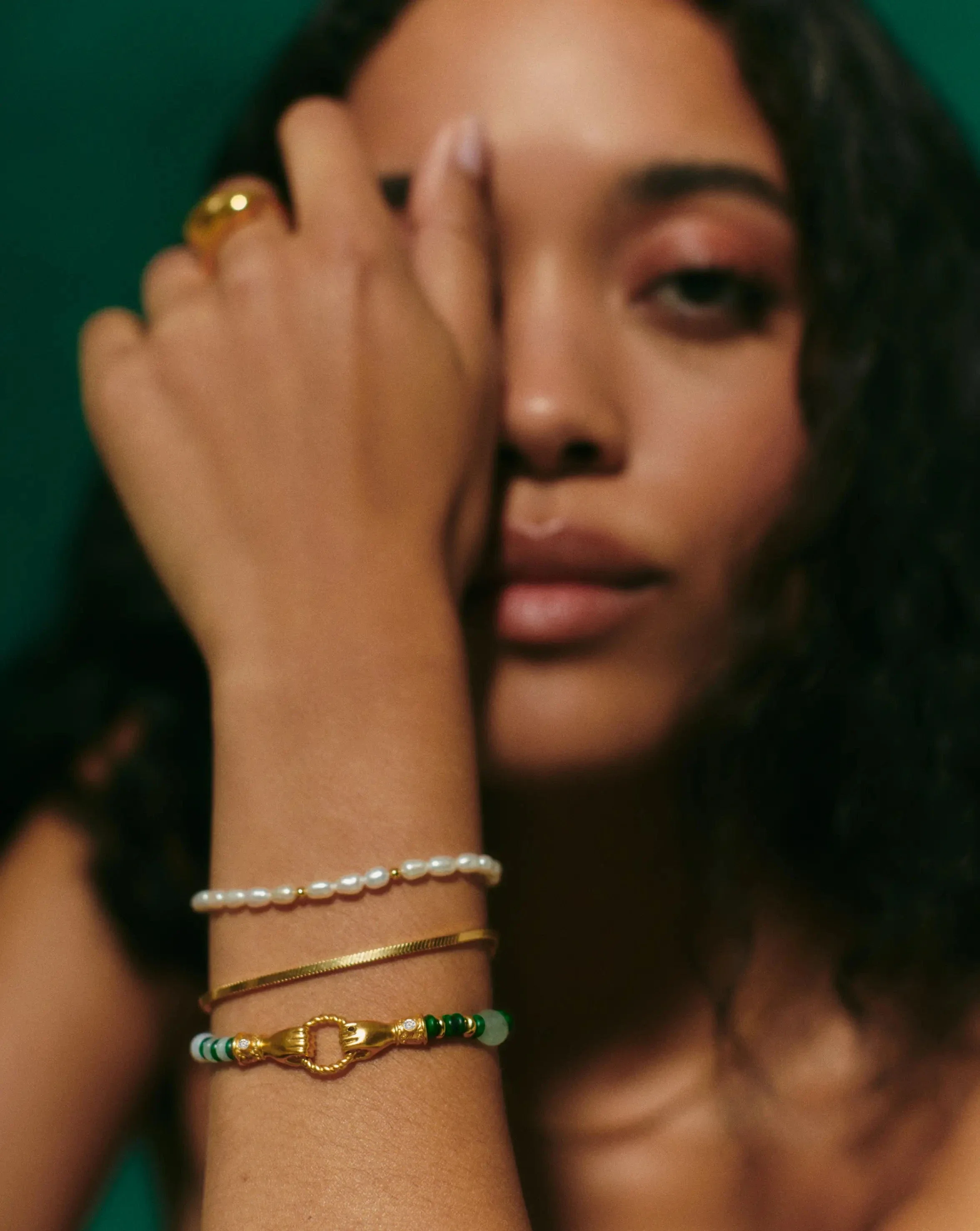 Harris Reed In Good Hands Beaded Gemstone Bracelet | 18k Gold Plated/Multi Green Gemstone & Pearl